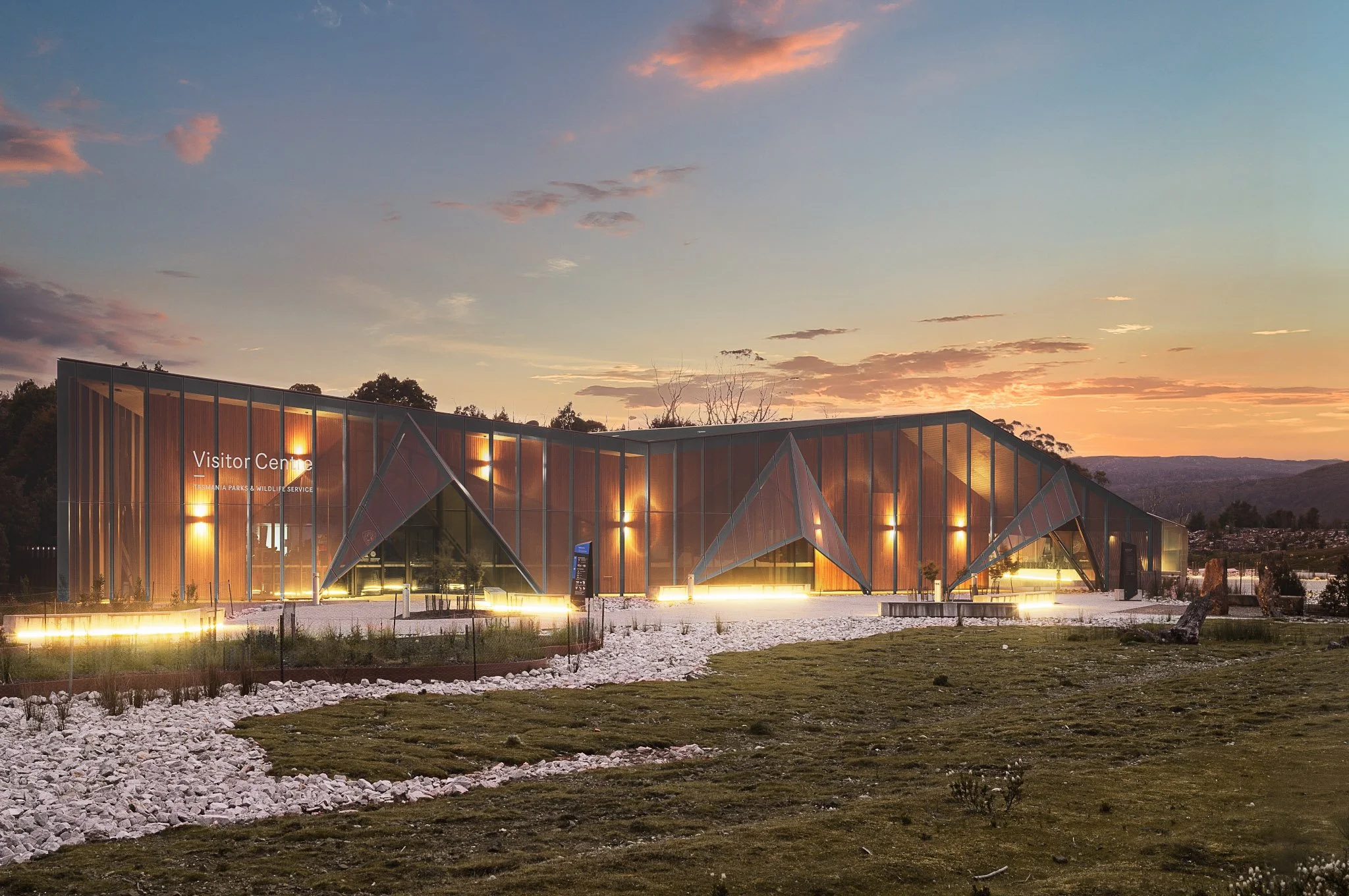 Cradle Mountain Visitor Centre, Cradle Mountain, Tasmania. Architect: Cumulus Studio. Client: Tasmania Parks & Wildlife Services. Landscape Architecture: Playstreet. Wayfinding and Interpretation: Futago. Engineering:Aldanmark. Lighting Design: Stantec. Quantity Surveyor: WT Partnership. Builder: Fairbrother Construction. Surveyors: Cohen & Associates. Additional contributors: Inspired by Marketing and Creative Hat Interpretation.